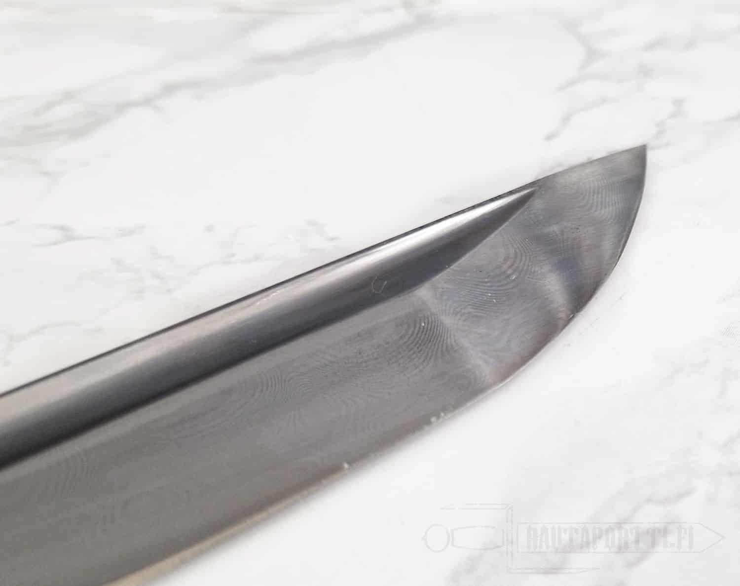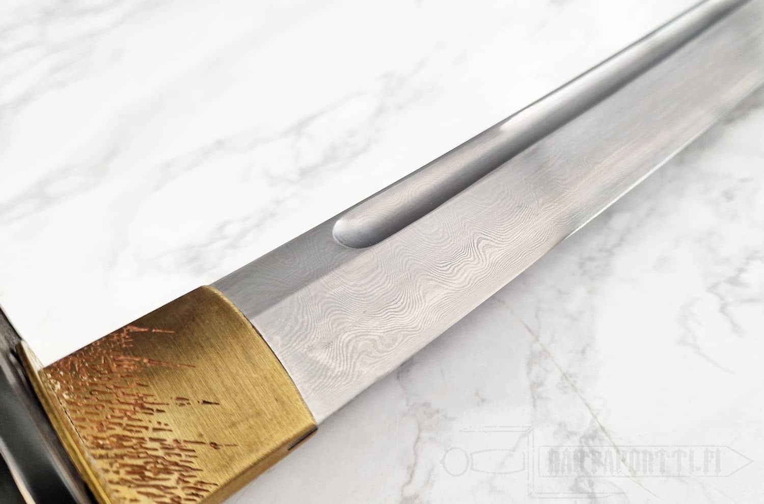 - Terän materiaali/Nagasa material: Käsin taottu savikarkaistu Maru 1095 kerrostaottu teräs