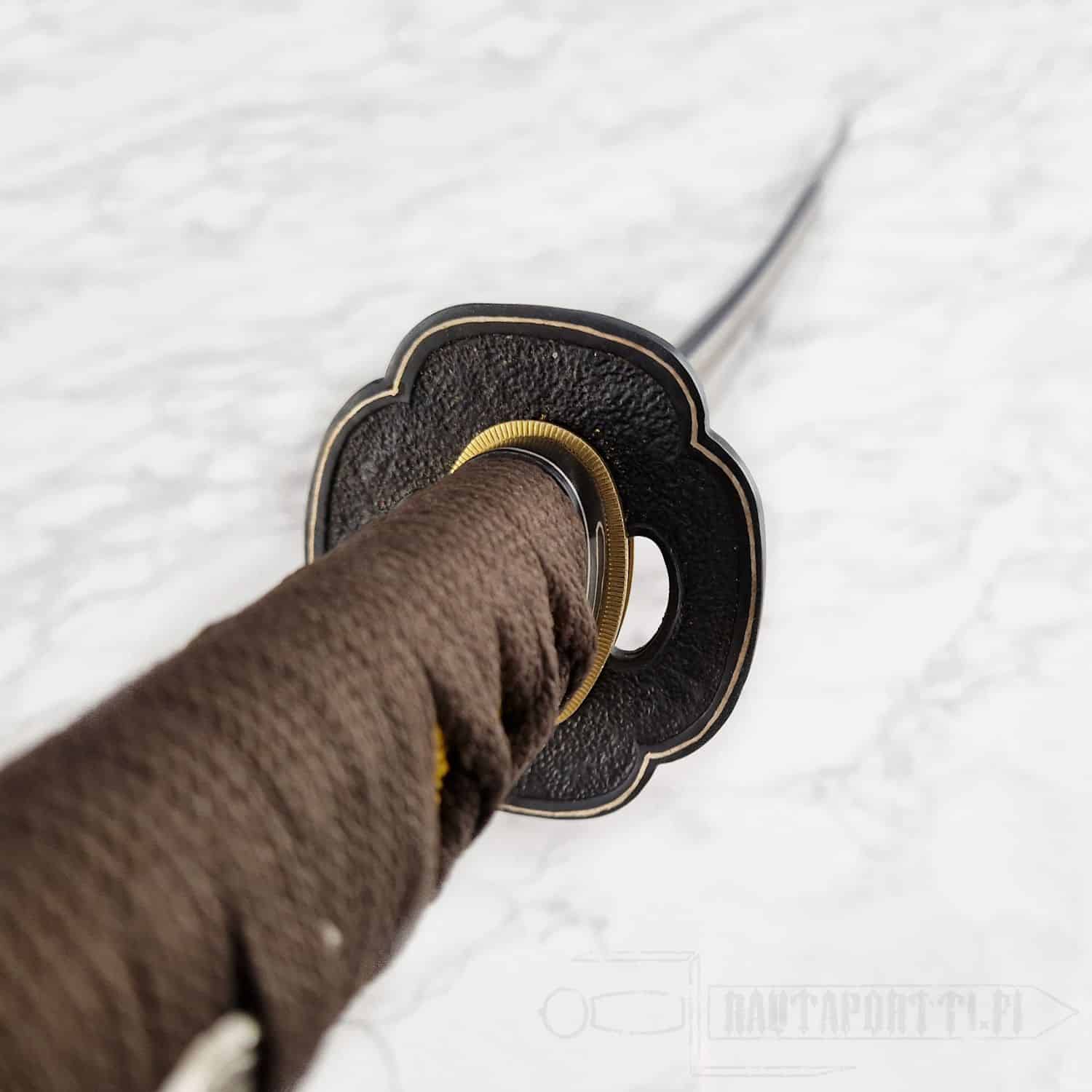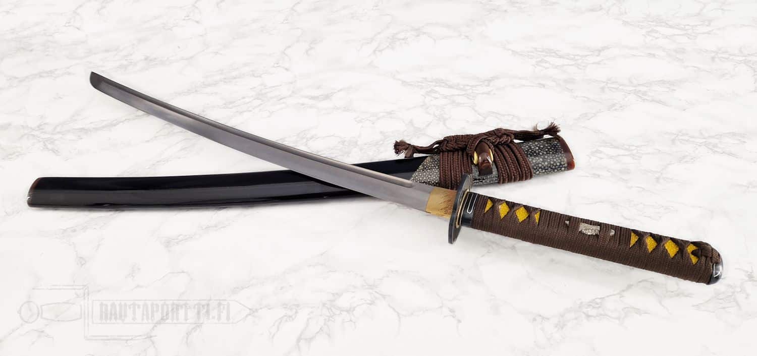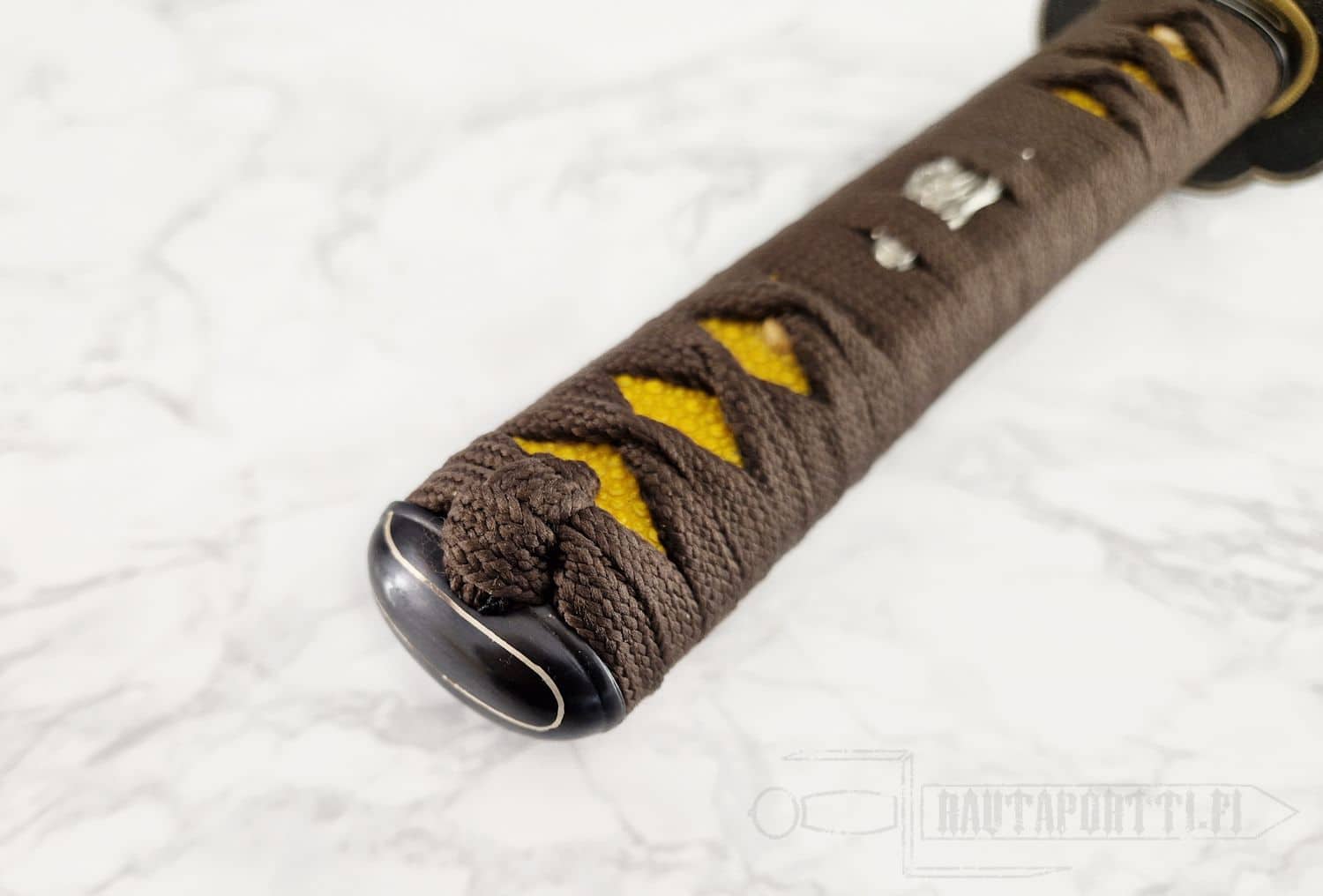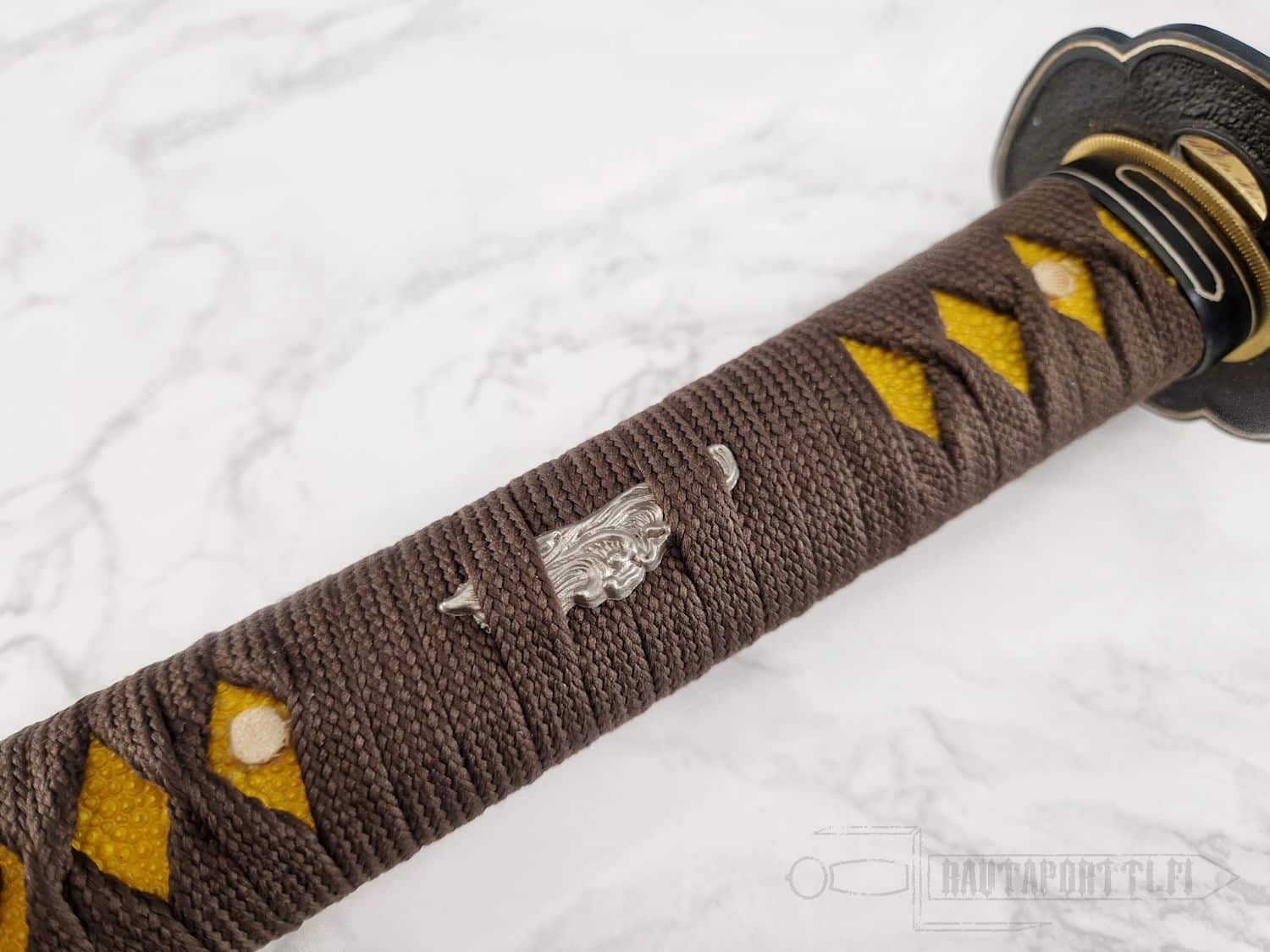 Kokonaisuus huokuu harkittua viimeistelyä: kovapuinen kahva on sidottu ruskealla silkkisidonnalla katatemaki-tekniikalla, ja yksityiskohtina ovat hopeapinnoitetut menukit sekä hopeareunuksin koristellut rautaiset tsuba, kashira ja fuchi. Silkkisidonnan alla kahvaa viimeistelee värjätty same (rauskun nahka).