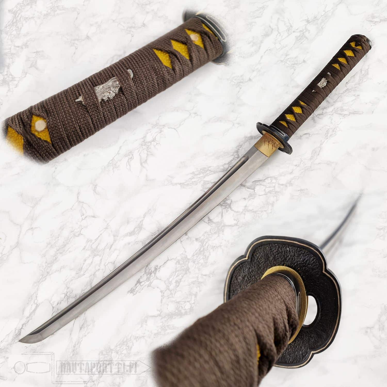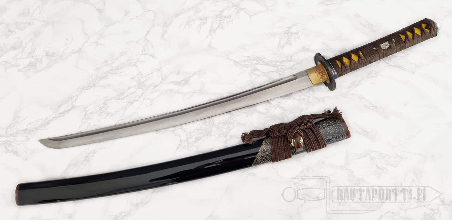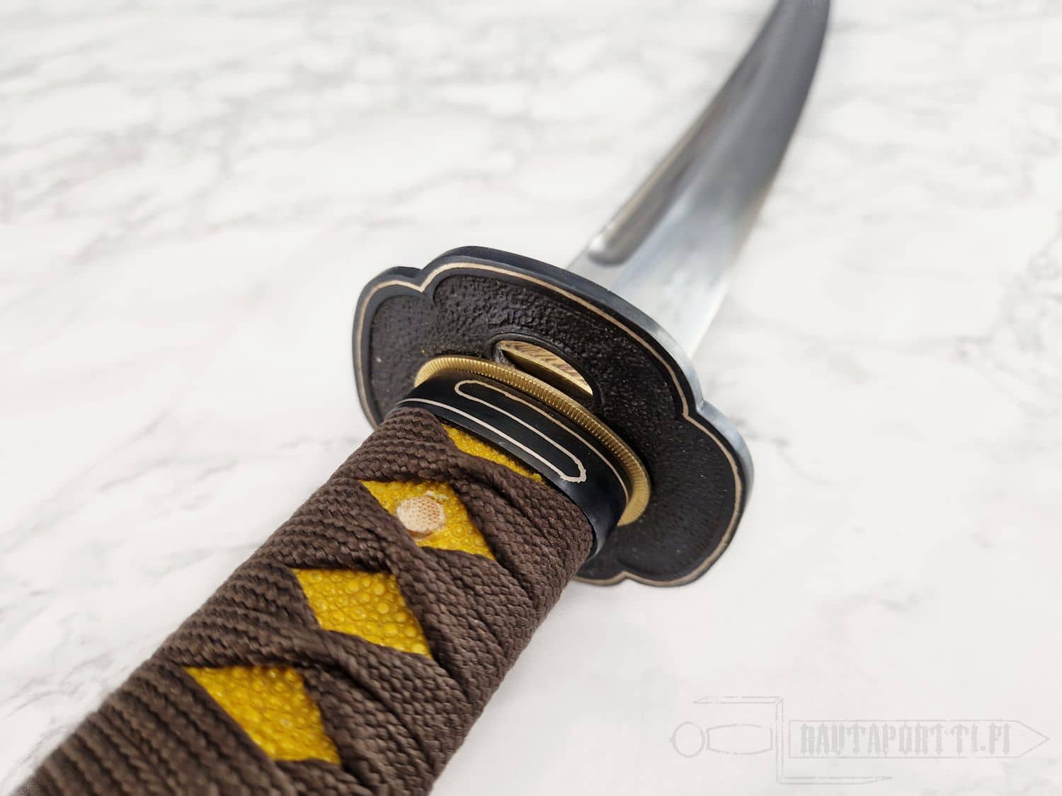 Kokonaisuus huokuu harkittua viimeistelyä: kovapuinen kahva on sidottu ruskealla silkkisidonnalla katatemaki-tekniikalla, ja yksityiskohtina ovat hopeapinnoitetut menukit sekä hopeareunuksin koristellut rautaiset tsuba, kashira ja fuchi. Silkkisidonnan alla kahvaa viimeistelee värjätty same (rauskun nahka).
