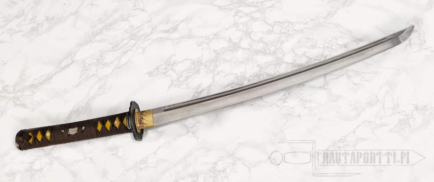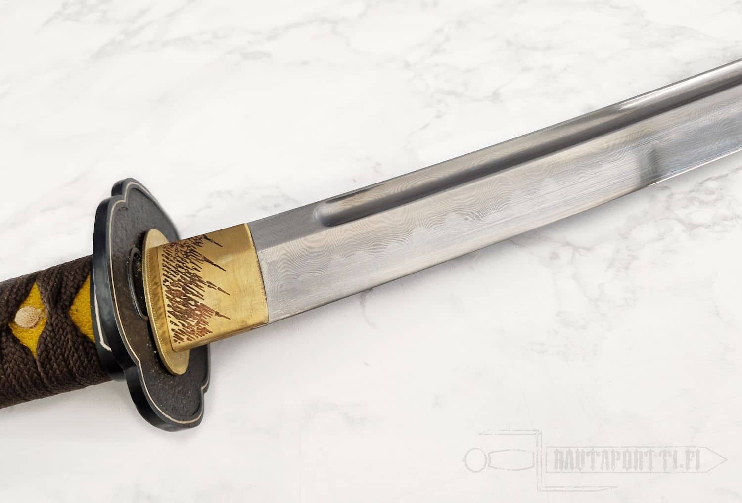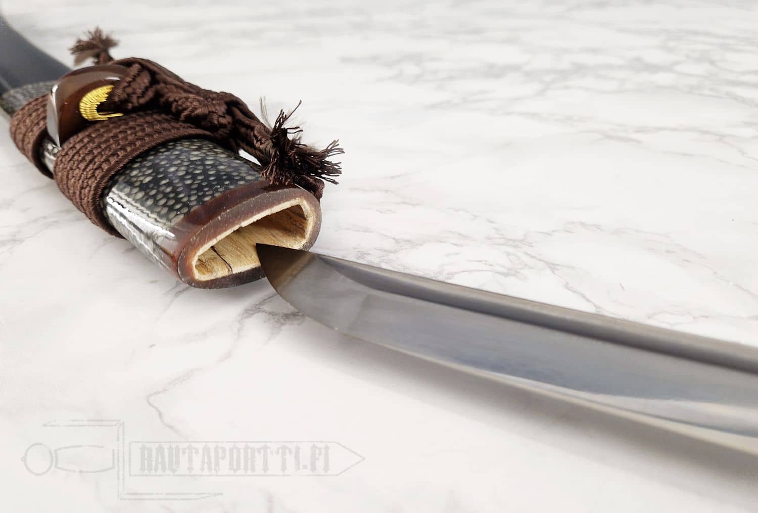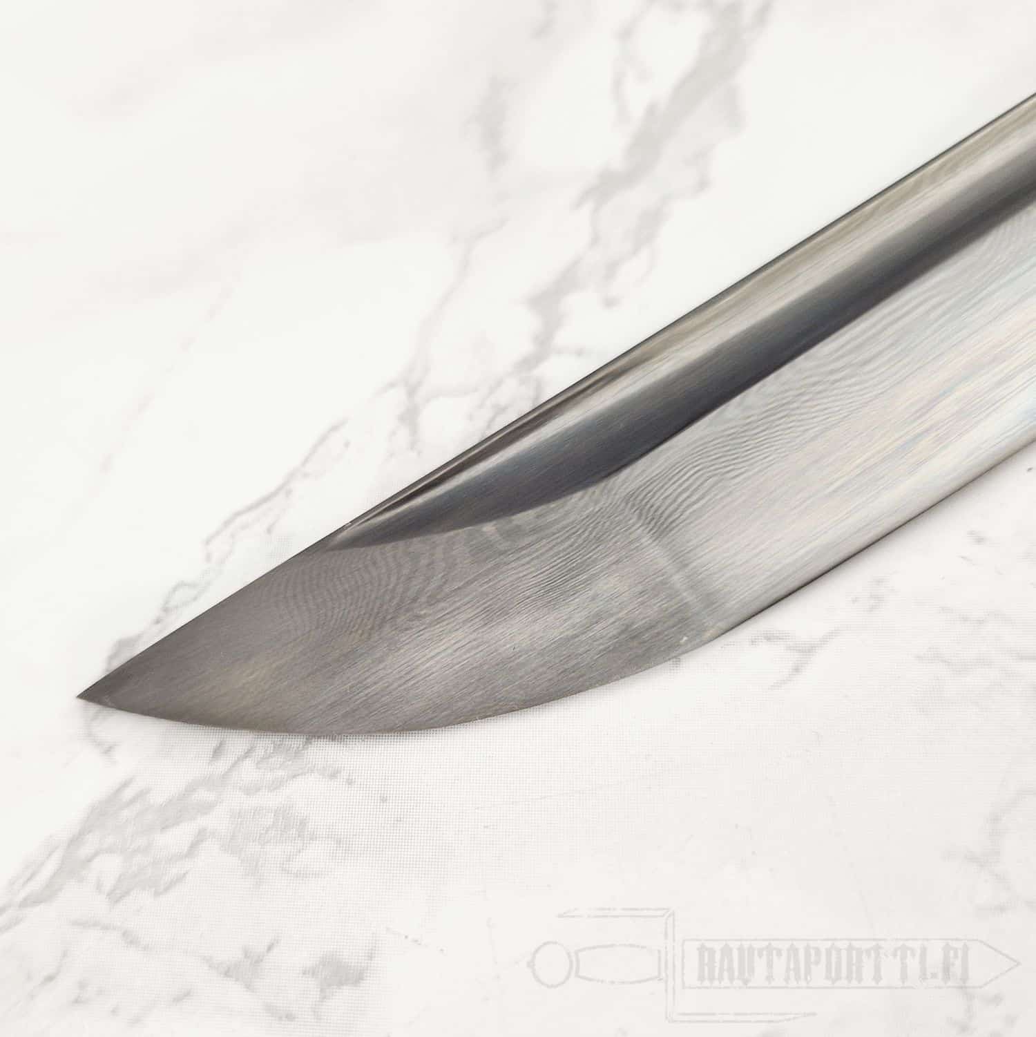 - Terän materiaali/Nagasa material: Käsin taottu savikarkaistu Maru 1095 kerrostaottu teräs