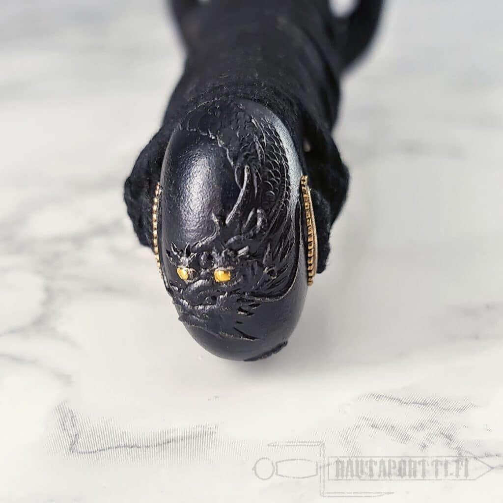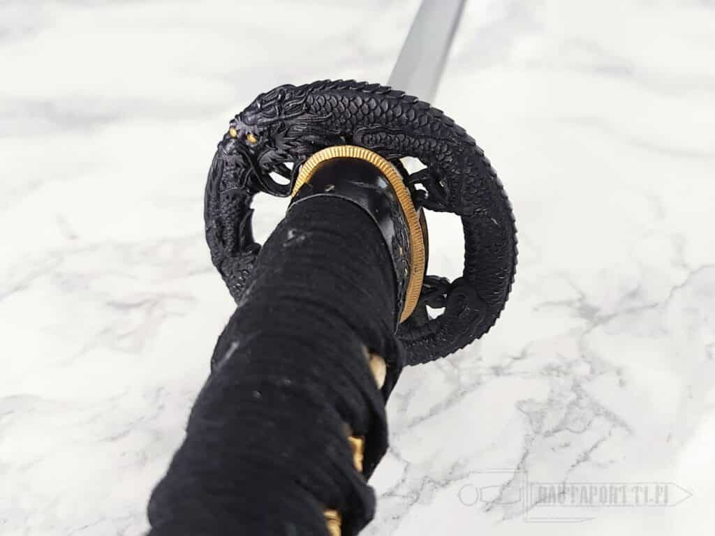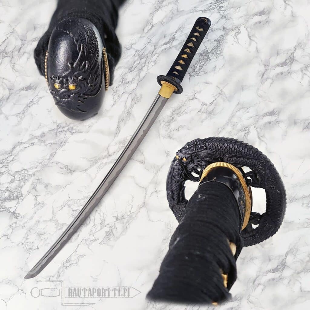 Kahvassa on aitoa valkoista samea (rauskun nahkaa) ja kahvan nyöritys (tsuka-ito) on valmistettu korkealaatuisesta mustasta japanilaisesta puuvillasta. Tsuka on koristeltu messinkisillä menuki-koristeilla, jotka koristavat kahvaa, mutta mahdollistavat myös paremman otteen kahvasta. Puinen saya on viimeistelty syvänmustalla lakalla ja mustalla puuvillaisella sageolla. Rautainen tsuba muodostuu hienosti kaiverretusta lohikäärmeestä. Tsuban molemmat puolet ovat saman lohikäärmeen jatkumoa ja pienet detaljit ovat kullalla päällystettyjä. Tämä wakizashi toimitetaan suojaavan kangaspussin ja perinteisen japanilaisen huoltosarjan kanssa.
