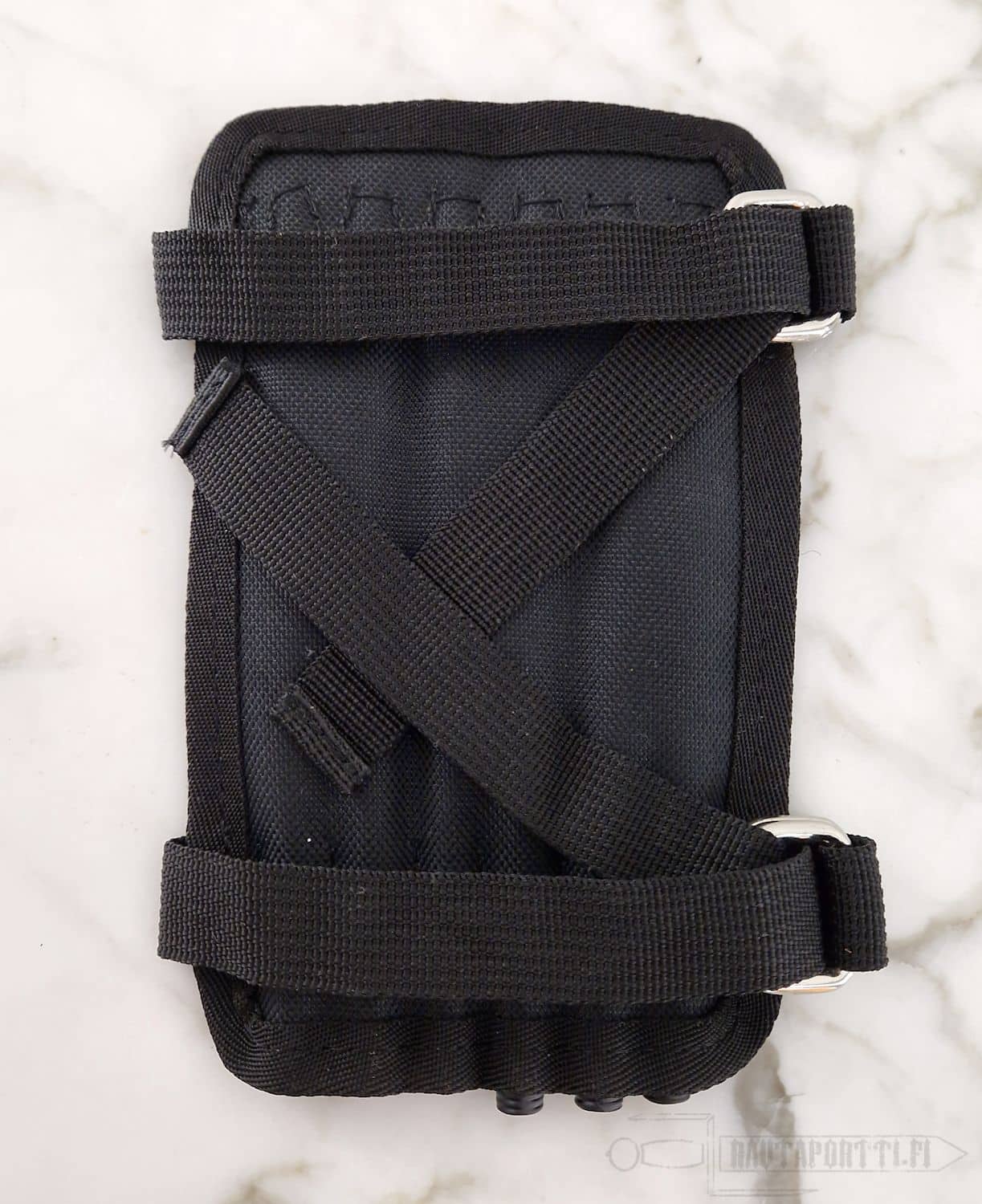 - Mukana kantotuppi, joka voidaan kiinnittää käsivarteen