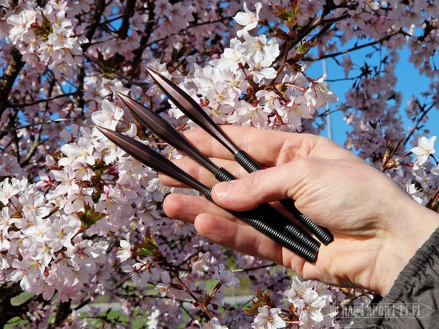 Shurikeneja saatettiin myös päällystää myrkyllä, jolloin jopa pienet haavat saattoivat lamauttaa tai tappaa vastustajan. Ninjat toimivat usein salakavalasti ja oveluutta apuna käyttäen, joten myrkkyjen käyttäminen oli heille luonnollinen valinta. Shurikeneja voitiin myös upottaa maahan ansoiksi, piilottaa strategisiin paikkoihin tai käyttää käsitaistelussa hätäratkaisuna kuin pientä tikaria. Tämä Shuriken-setti sisältää kuusi heittopiikkiä ja käsivarteen kiinnitettävän kantokotelon/tupen. Heittopiikit on sinistetty/mustattu mustiksi ninja-perinteen mukaisesti.