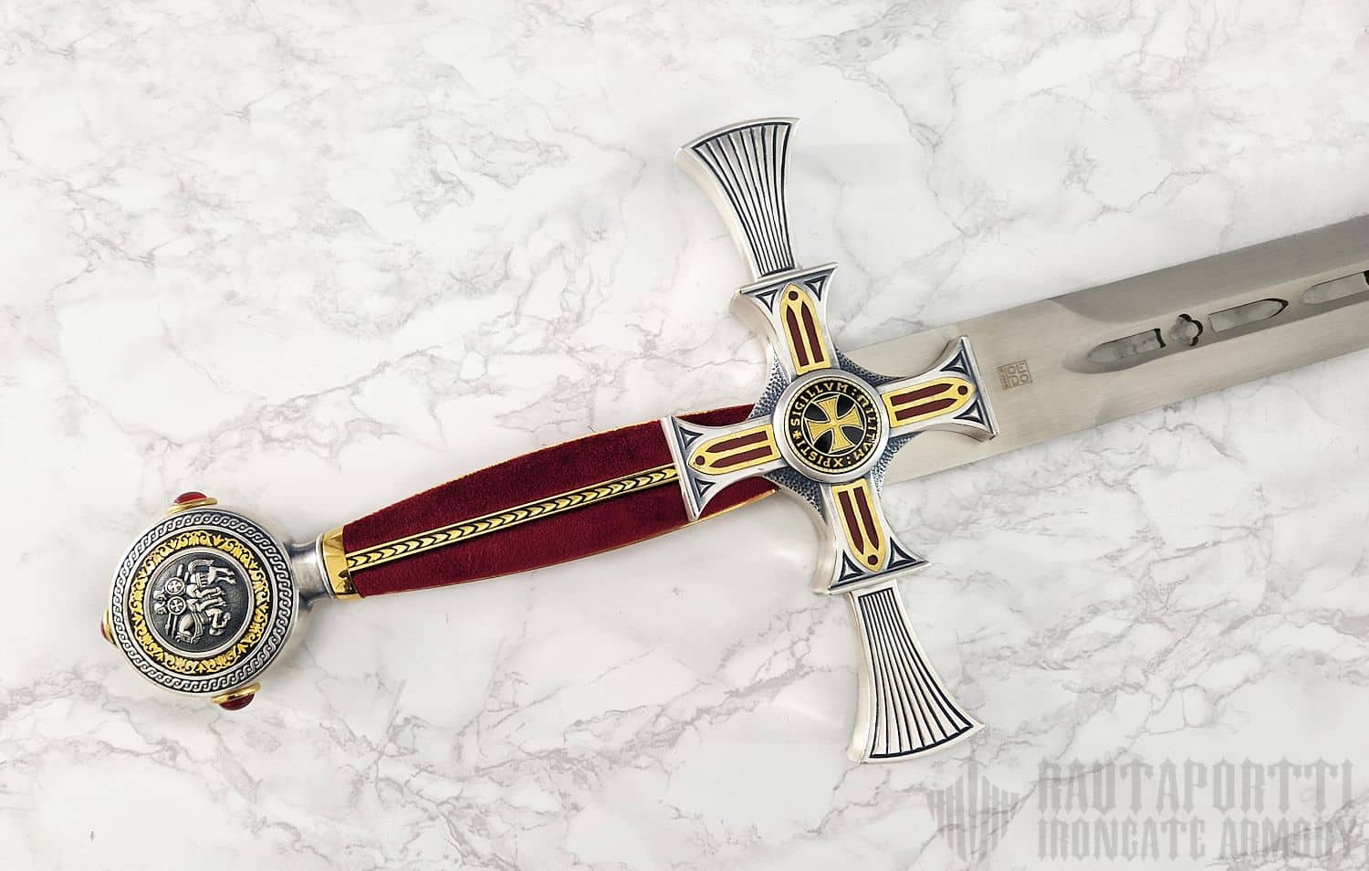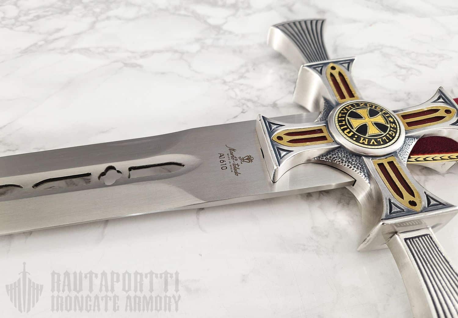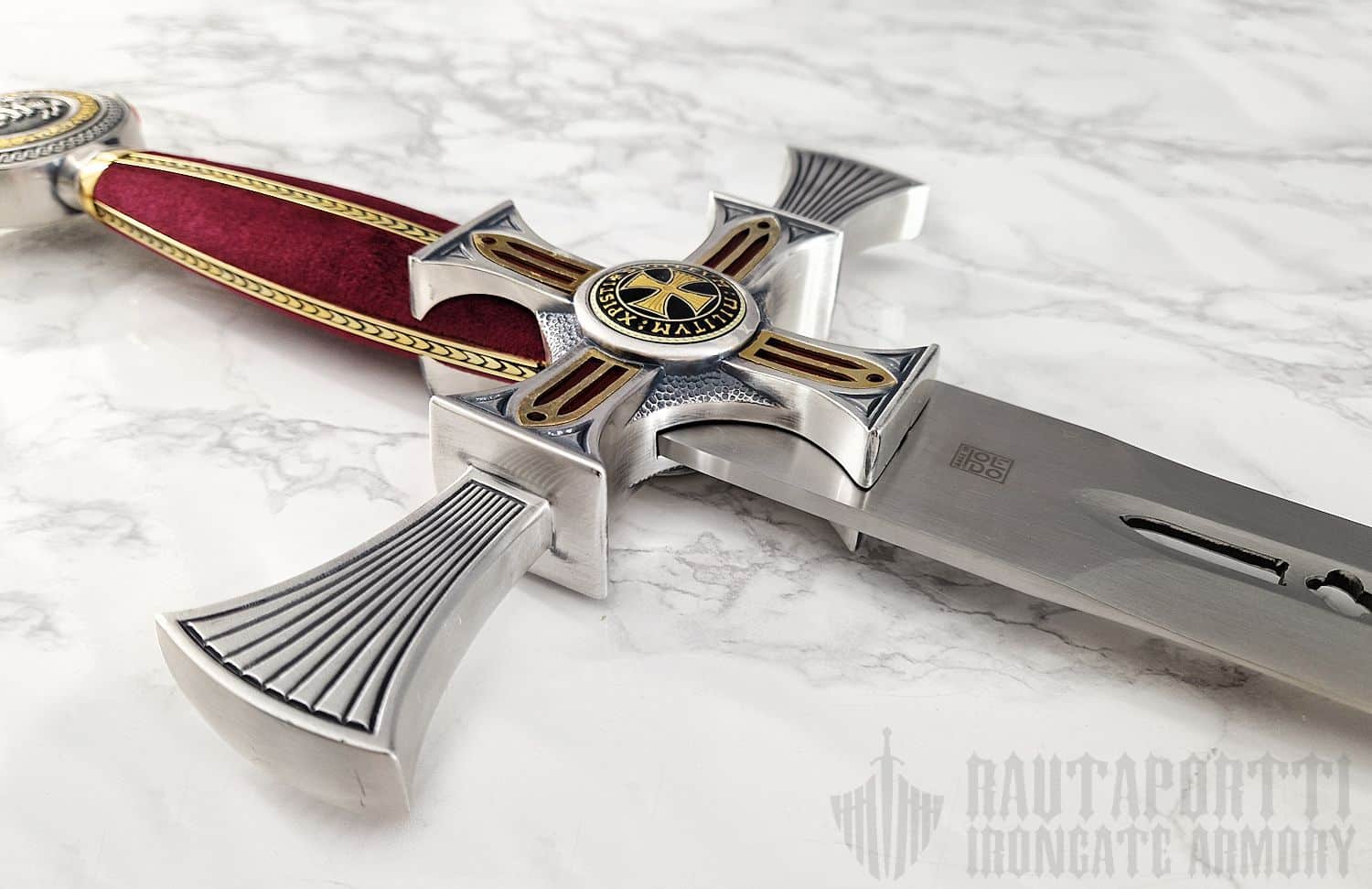 Meidän Temppeliherrain miekkamme yksityiskohtaisesti koristellussa väistissä ja ponnessa on useita Temppeliherroihin liitettyjä muotoja, symboleja ja tunnuskuvia. Ponnen koristeena esimerkiksi on Temppeliherrojen ritarikunnan sinetti, jossa kaksi ratsastajaa. Temppeliherrat käyttivät tottahan toki erilaisia sinettejä vuosisatojen kuluessa, mutta tämä oli yksi yleisimmin käytetyistä ja on nykypäivänäkin parhaiten tunnettu. Legendan mukaan nämä kaksi ratsastajaa ovat Hugues de Payens (ensimmäinen suurmestari) ja Godfrey de Saint-Omerwere (yksi temppeliherrain ritarikunnan perustajajäsenistä). Legendan mukaan he olivat niin köyhiä, että heillä oli kahdestaan varaa vain yhteen hevoseen. Tästä saatiin kuuluisa kuva sinettiin, jossa kaksi miestä ratsastaa yhdellä hevosella. Ristinmuotoisen kahvaosan keskellä on temppeliherrojen Maltan risti, sekä teksti SIGILLUM MILITUM XPISI, eli Kristuksen sotilaiden sinetti latinaksi. Tässä miekan versiossa on myös ylellistä punaista samettia kahvassa, ja terä on koko matkaltaan koristeltu läpileikkauskuvioin. Hopeisessa kahvaosassa on kultaista upotuskoristelua, damasquinado, jonka tekemisen taitoa Toledossa yhä pidetään yllä.