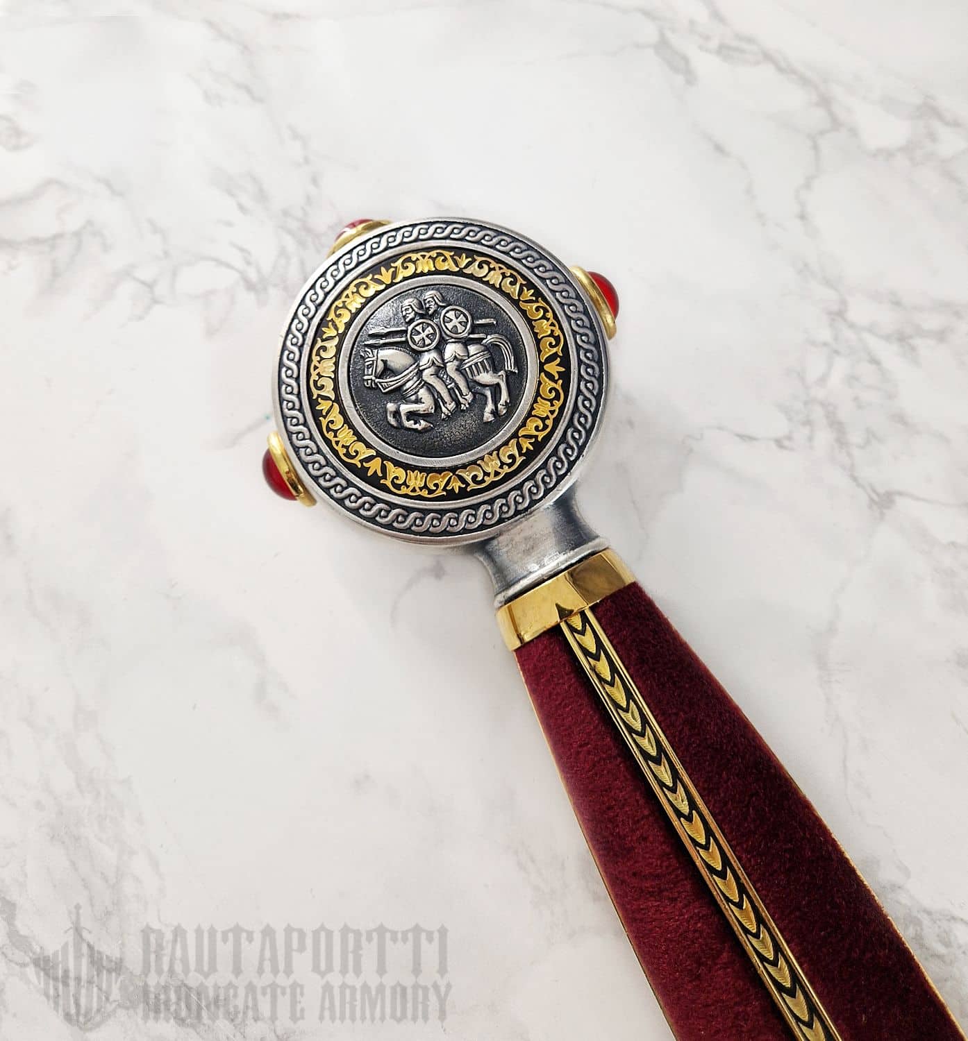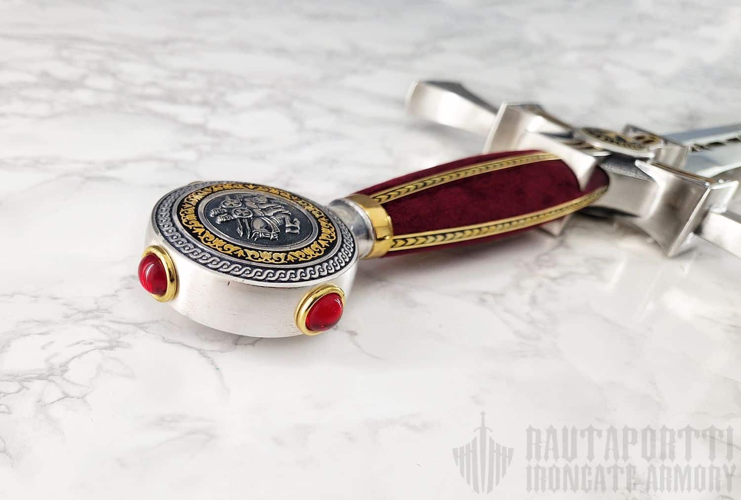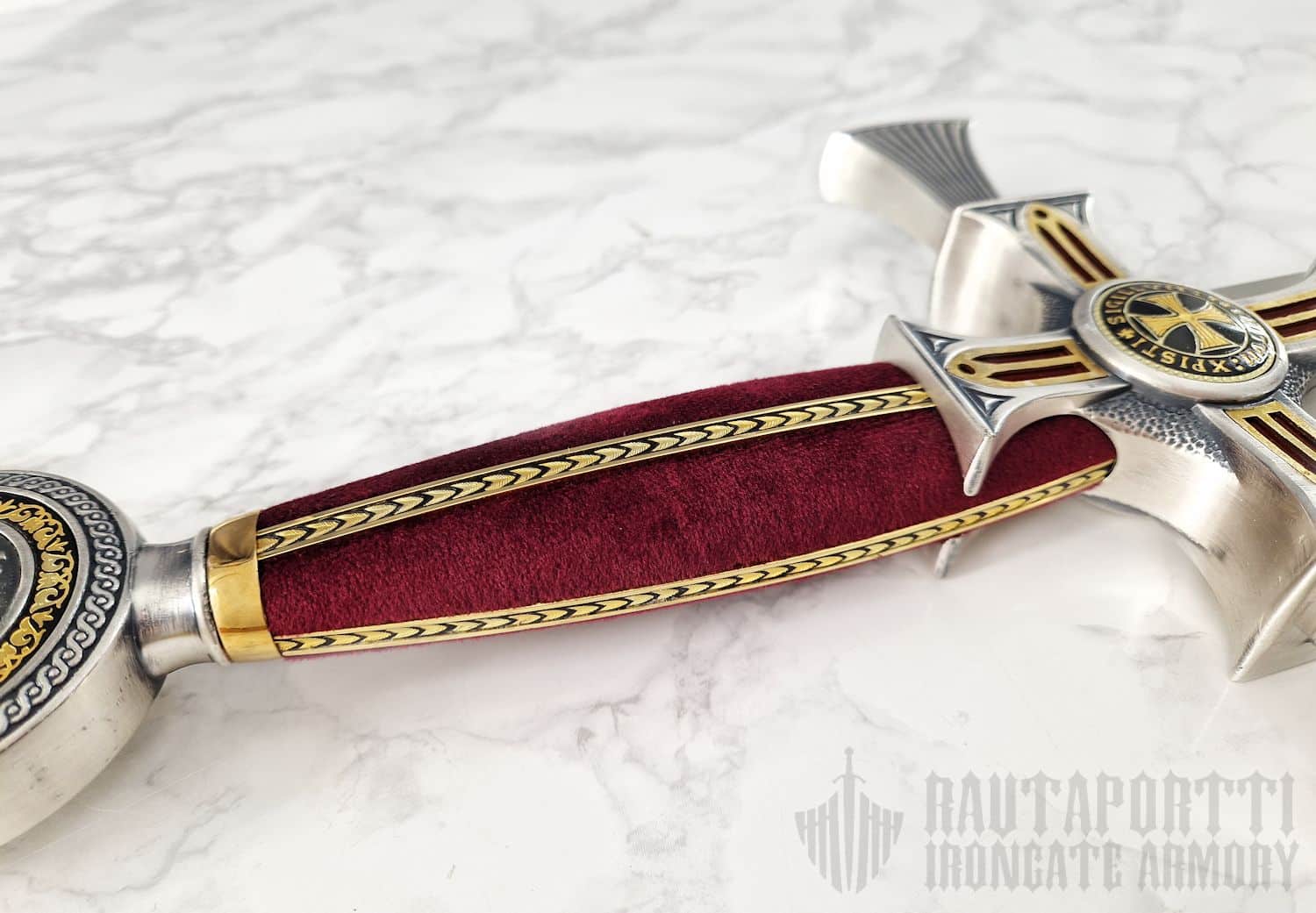 Meidän Temppeliherrain miekkamme yksityiskohtaisesti koristellussa väistissä ja ponnessa on useita Temppeliherroihin liitettyjä muotoja, symboleja ja tunnuskuvia. Ponnen koristeena esimerkiksi on Temppeliherrojen ritarikunnan sinetti, jossa kaksi ratsastajaa. Temppeliherrat käyttivät tottahan toki erilaisia sinettejä vuosisatojen kuluessa, mutta tämä oli yksi yleisimmin käytetyistä ja on nykypäivänäkin parhaiten tunnettu. Legendan mukaan nämä kaksi ratsastajaa ovat Hugues de Payens (ensimmäinen suurmestari) ja Godfrey de Saint-Omerwere (yksi temppeliherrain ritarikunnan perustajajäsenistä). Legendan mukaan he olivat niin köyhiä, että heillä oli kahdestaan varaa vain yhteen hevoseen. Tästä saatiin kuuluisa kuva sinettiin, jossa kaksi miestä ratsastaa yhdellä hevosella. Ristinmuotoisen kahvaosan keskellä on temppeliherrojen Maltan risti, sekä teksti SIGILLUM MILITUM XPISI, eli Kristuksen sotilaiden sinetti latinaksi. Tässä miekan versiossa on myös ylellistä punaista samettia kahvassa, ja terä on koko matkaltaan koristeltu läpileikkauskuvioin. Hopeisessa kahvaosassa on kultaista upotuskoristelua, damasquinado, jonka tekemisen taitoa Toledossa yhä pidetään yllä.