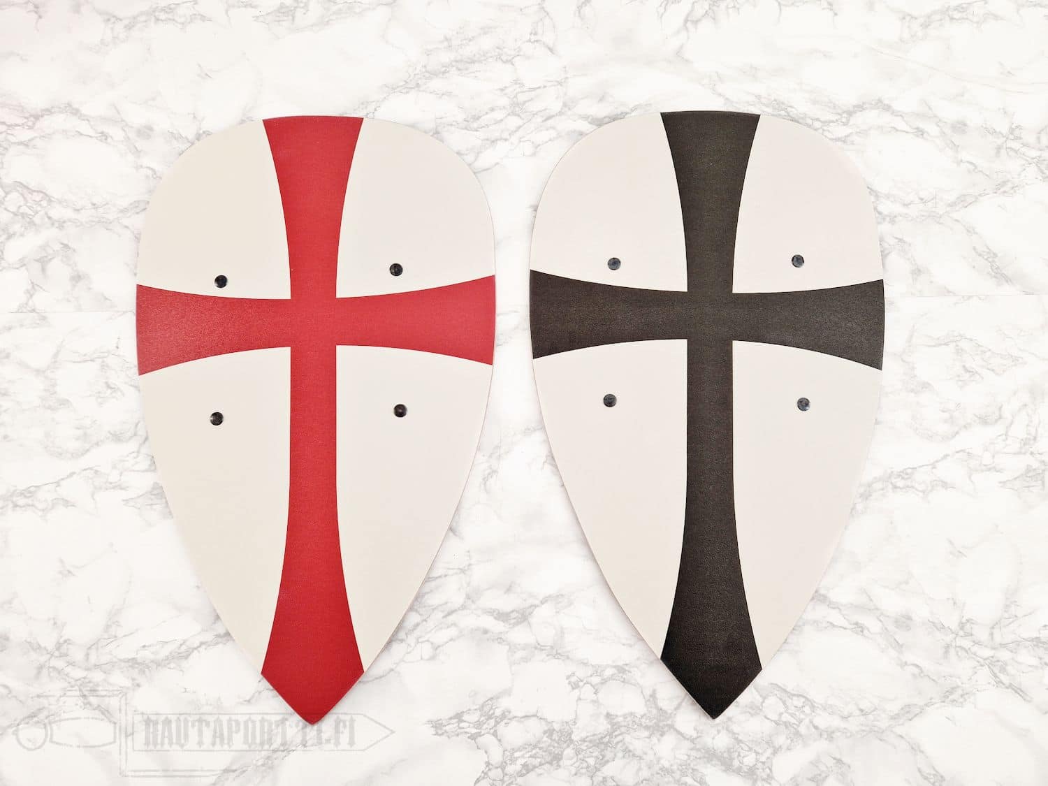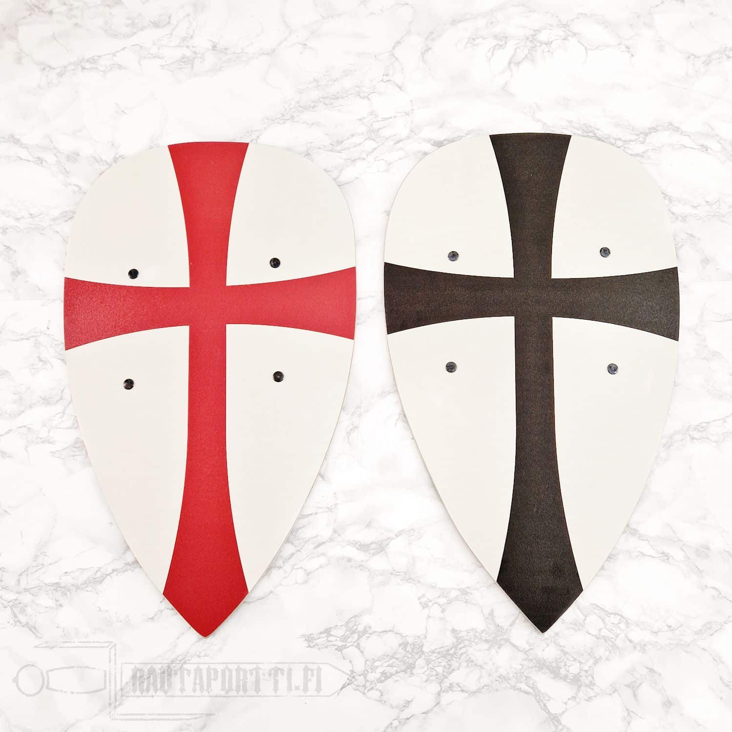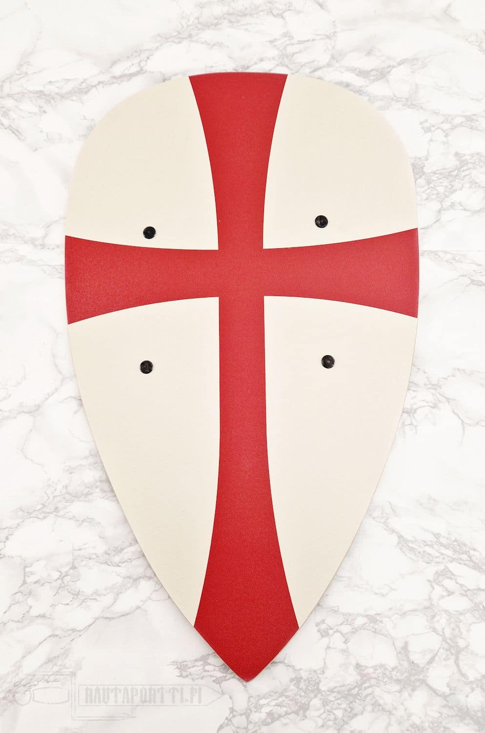 Tämä pisaranmallinen kilpi on koristeltu temppeliherrain ristillä. Temppeliherrat olivat kristillinen sotilasjärjestö, joka perustettiin 1100-luvulla ristiretkien aikana ja temppeliherrat olivat ehdottomasti yksi koko keskiajan parhaimmista sotajoukoista; asialleen vannoutuneita eliittisotilaita. He olivat tunnettuja rohkeudestaan taistelussa ja sitoutumisestaan suojella kristillisiä pyhiinvaeltajien, jotka matkustivat Pyhälle Maalle. Järjestö sai vaikutusvaltaa ja keräsi rikkauksia ympäri Eurooppaa ja tuli hyvin voimakkaaksi valtatekijäksi.