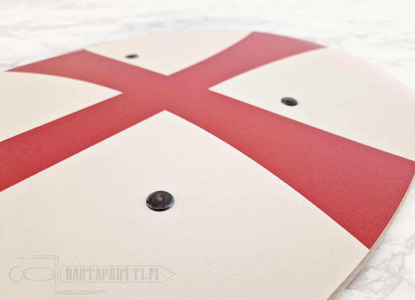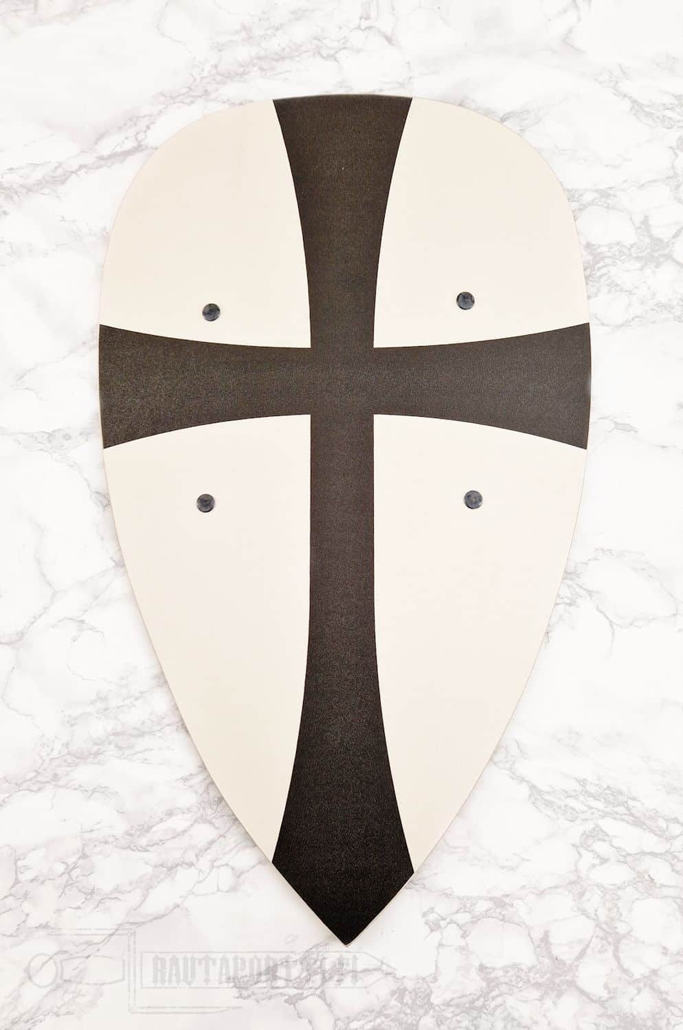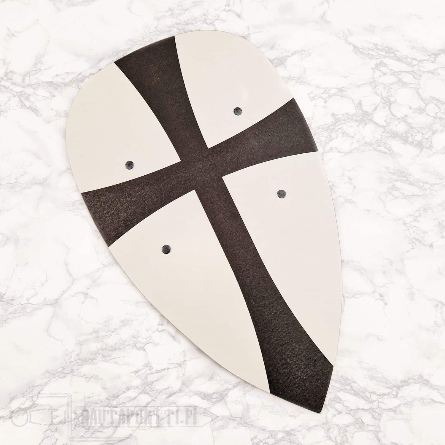 Tämä pisaranmallinen kilpi on koristeltu temppeliherrain ristillä. Temppeliherrat olivat kristillinen sotilasjärjestö, joka perustettiin 1100-luvulla ristiretkien aikana ja temppeliherrat olivat ehdottomasti yksi koko keskiajan parhaimmista sotajoukoista; asialleen vannoutuneita eliittisotilaita. He olivat tunnettuja rohkeudestaan taistelussa ja sitoutumisestaan suojella kristillisiä pyhiinvaeltajien, jotka matkustivat Pyhälle Maalle. Järjestö sai vaikutusvaltaa ja keräsi rikkauksia ympäri Eurooppaa ja tuli hyvin voimakkaaksi valtatekijäksi.