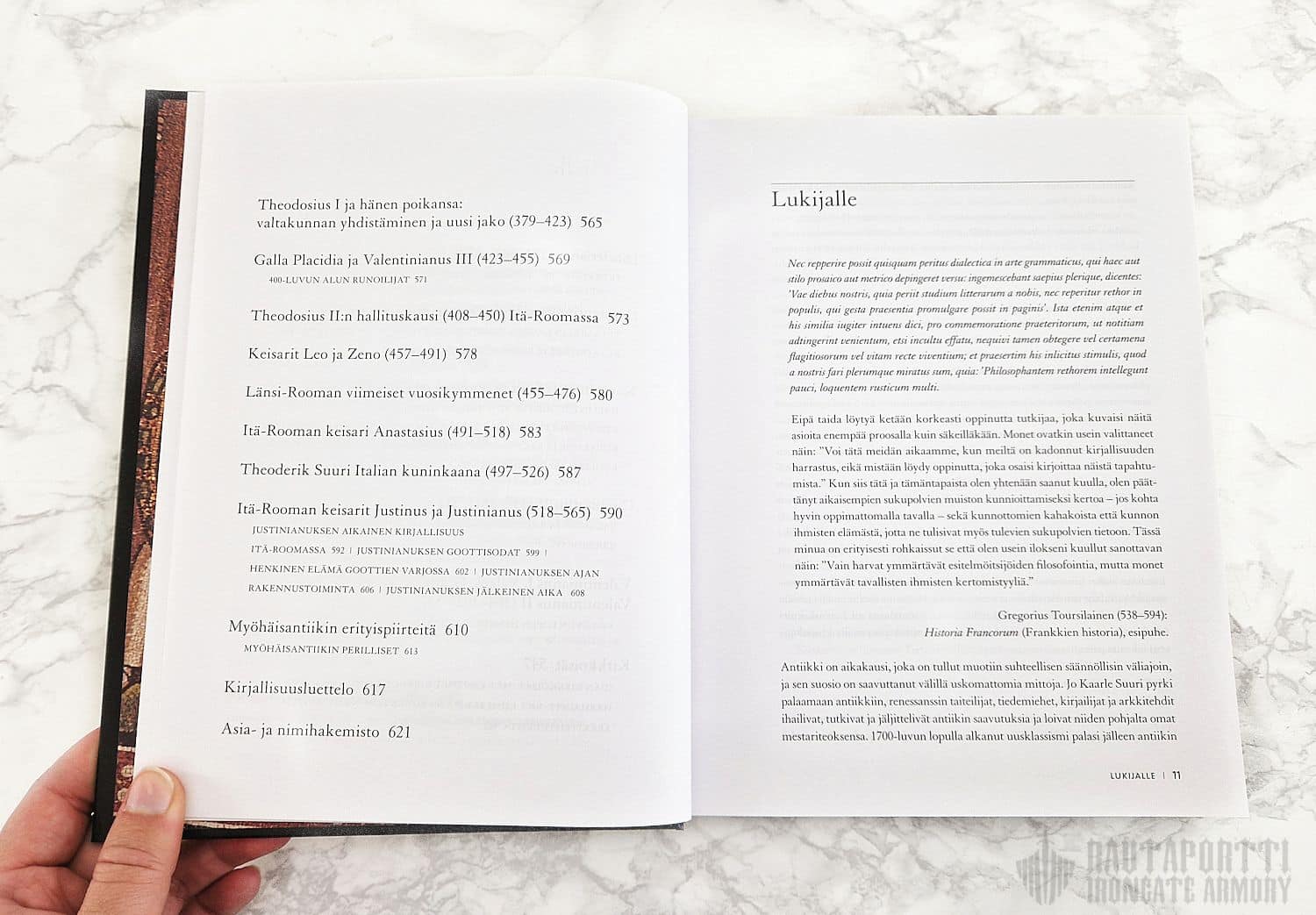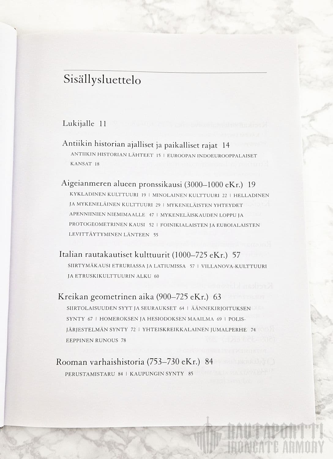 Liikkeelle lähdetään kreikkalaisen maailman pronssikaudesta ja matkataan läpi Kreikan kukoistuskauden unohtamatta politiikkaa, taloutta, tieteitä, kirjallisuutta ja taiteita. Rinnalla kulkee Italian ja Rooman kehitys primitiivisestä paimentolaisuudesta keisariajan loistoon ja häviöön asti. Kirjassa oikaistaan myös useita antiikkia koskevia piintyneitä, virheellisiä käsityksiä.
