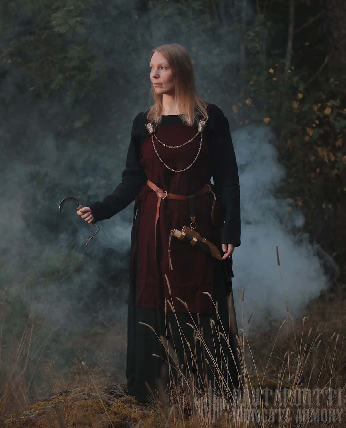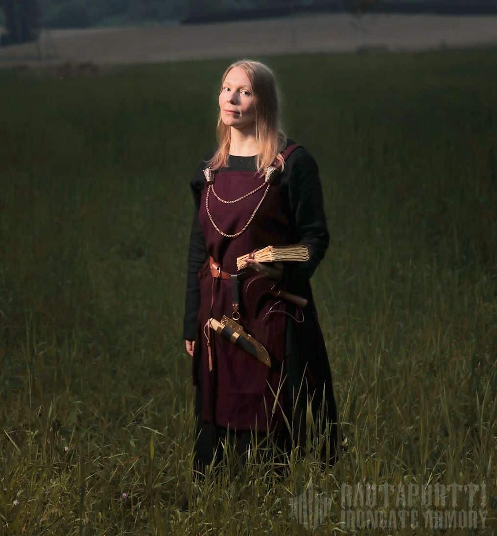 Tämä esiliinamekko toimii erittäin hyvin yksinkertaisen pitkähihaisen ja pitkähelmaisen alushameen kanssa. Kun kokonaisuuteen lisää vielä vyön, asu onkin valmis. Hyvä valinta jokaiselle kotitilallaan työskentelevälle viikinkinaiselle tai raivokkaalle kilpineidolle puolustamassa kotikylän rajoja tai kaukomaille ryöstöretkelle. Muutamien korujen ja koristeiden kanssa käytettynä tämä mekko sopii erinomaisesti myös varakkaalle johtajalle tai sukua johtavalle emännälle.