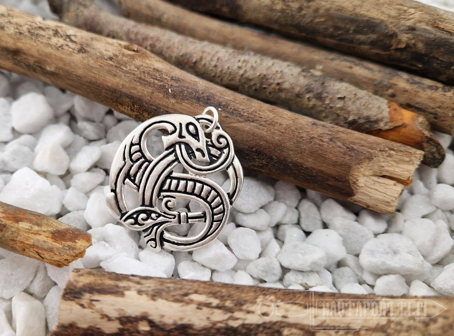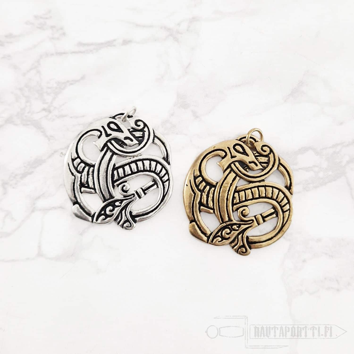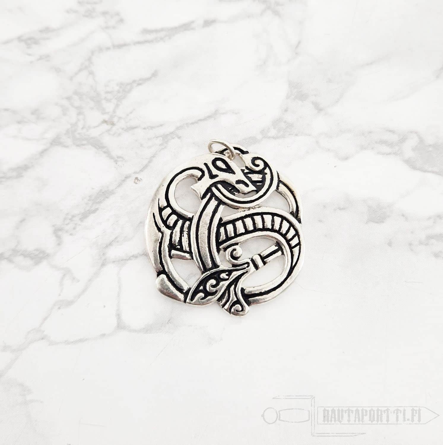 Tämä riipus esittää solmutekniikkalla tehtyä, itsensä ympärille kietoutunutta lohikäärmettä. Riipus on tehty useiden viikinkiaikaisten koristeiden, löytöjen ja sen aikaisen taiteen pohjalta, vaikka ei olekaan suora kopio mistään yhdestä tietystä korusta tai koristeesta. Tämä riipus on täydellinen asuste viikingeistä, historiasta tai fantasiasta kiinnostuneelle ihmiselle, ja sopiipa se mainiosti myös lahjaksi!