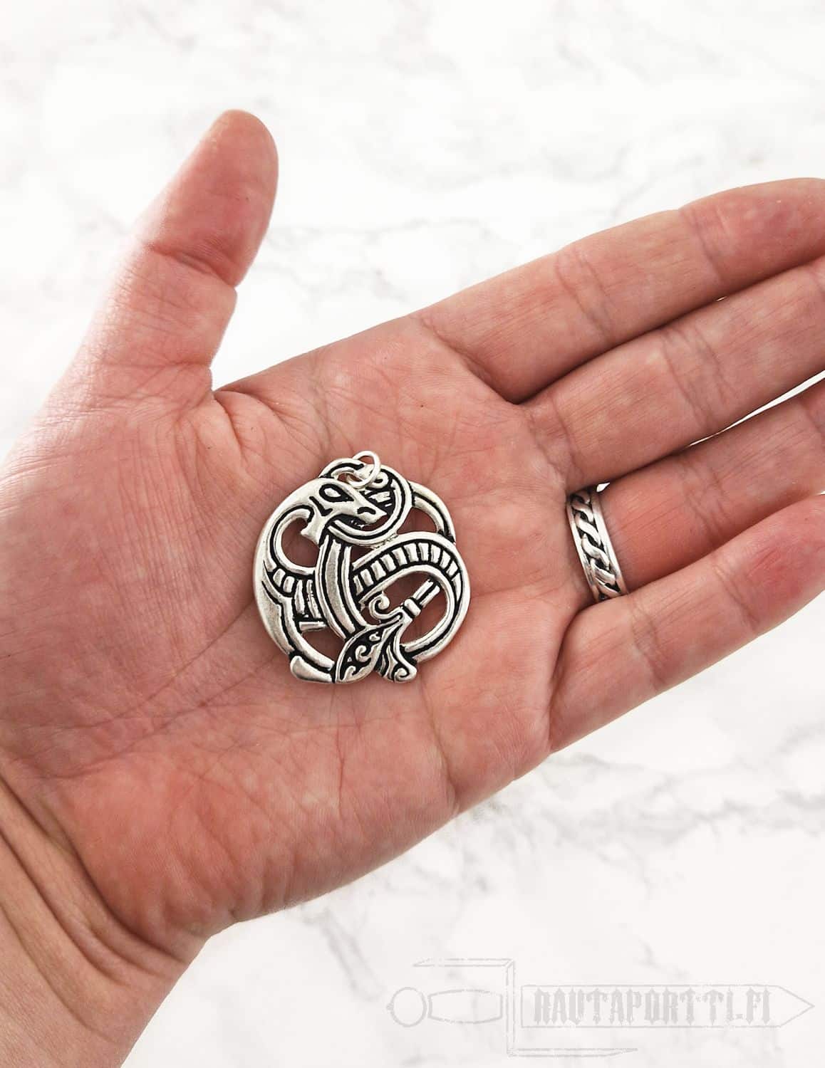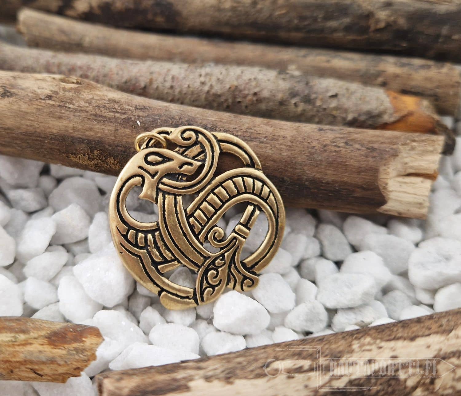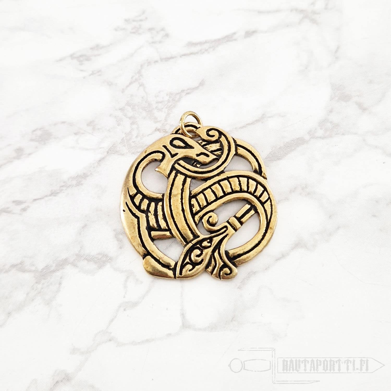 Tämä riipus esittää solmutekniikkalla tehtyä, itsensä ympärille kietoutunutta lohikäärmettä. Riipus on tehty useiden viikinkiaikaisten koristeiden, löytöjen ja sen aikaisen taiteen pohjalta, vaikka ei olekaan suora kopio mistään yhdestä tietystä korusta tai koristeesta. Tämä riipus on täydellinen asuste viikingeistä, historiasta tai fantasiasta kiinnostuneelle ihmiselle, ja sopiipa se mainiosti myös lahjaksi!