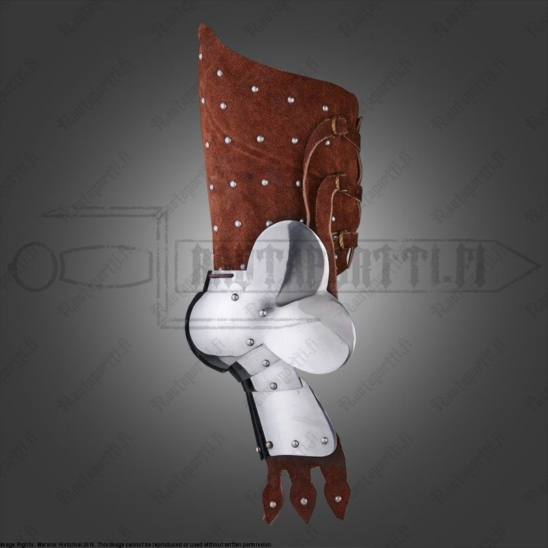 Tämä polvi- ja reisisuoja on valmistettu paksusta mokkanahasta ja 2 mm paksuista teräsliuskeista. Jaloissa on säädettävät kiristyshihnat reiden ja polven takana, ne ovat taipuisat ja suhteellisen kevyet. Painoa on n. 5,4 kg per pari. Nahan luonteesta johtuen pinnassa saattaa olla pieniä jälkiä tai epätasaisuuksia. Pinnan karheus ja värisävy saattaa vaihdella hieman kappaleesta toiseen värjäysprosessissa käytettävien perinteisten työtapojen sekä nahan ominaisuuksien vuoksi. Paketissa suojat molemmille jaloille.
