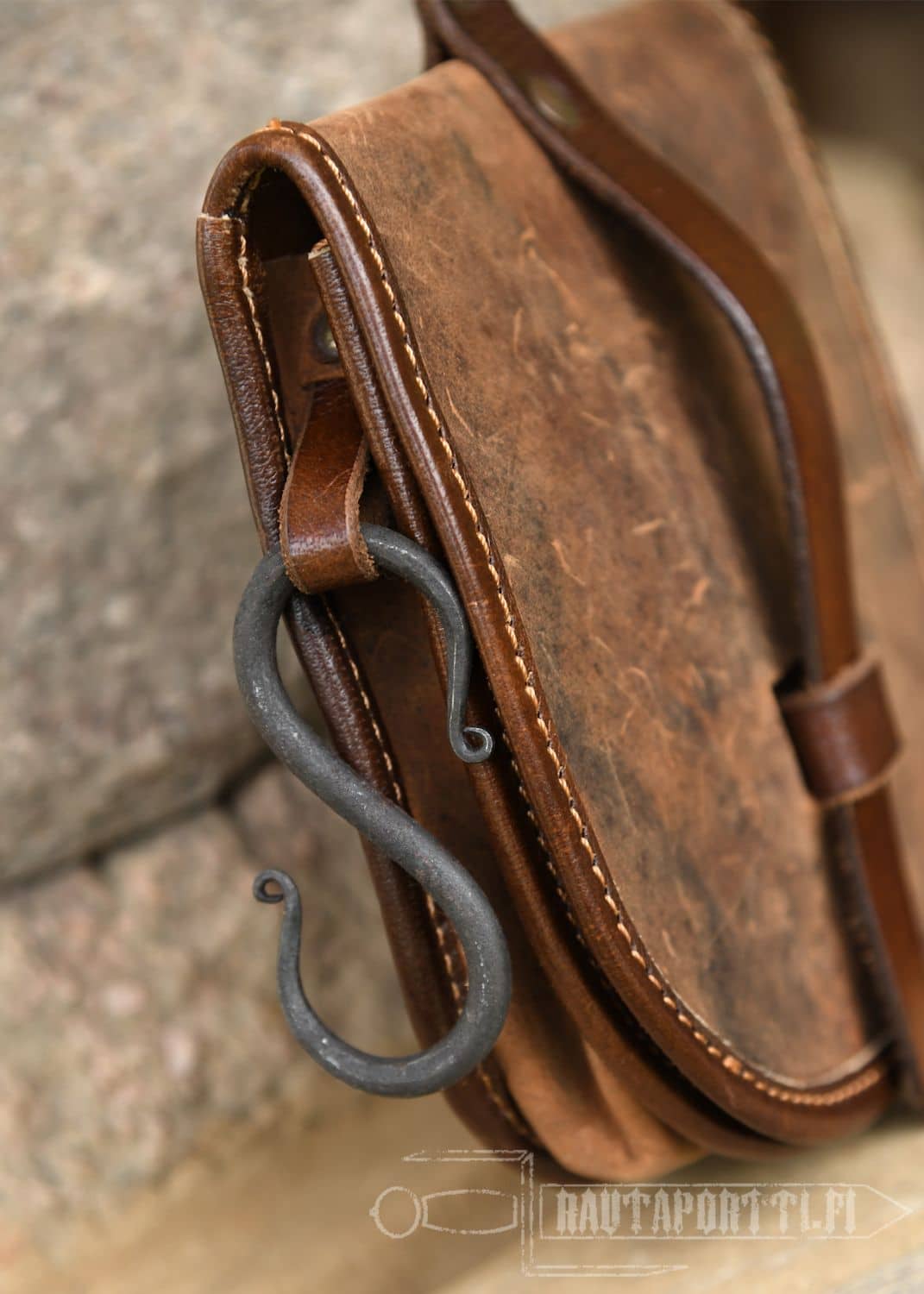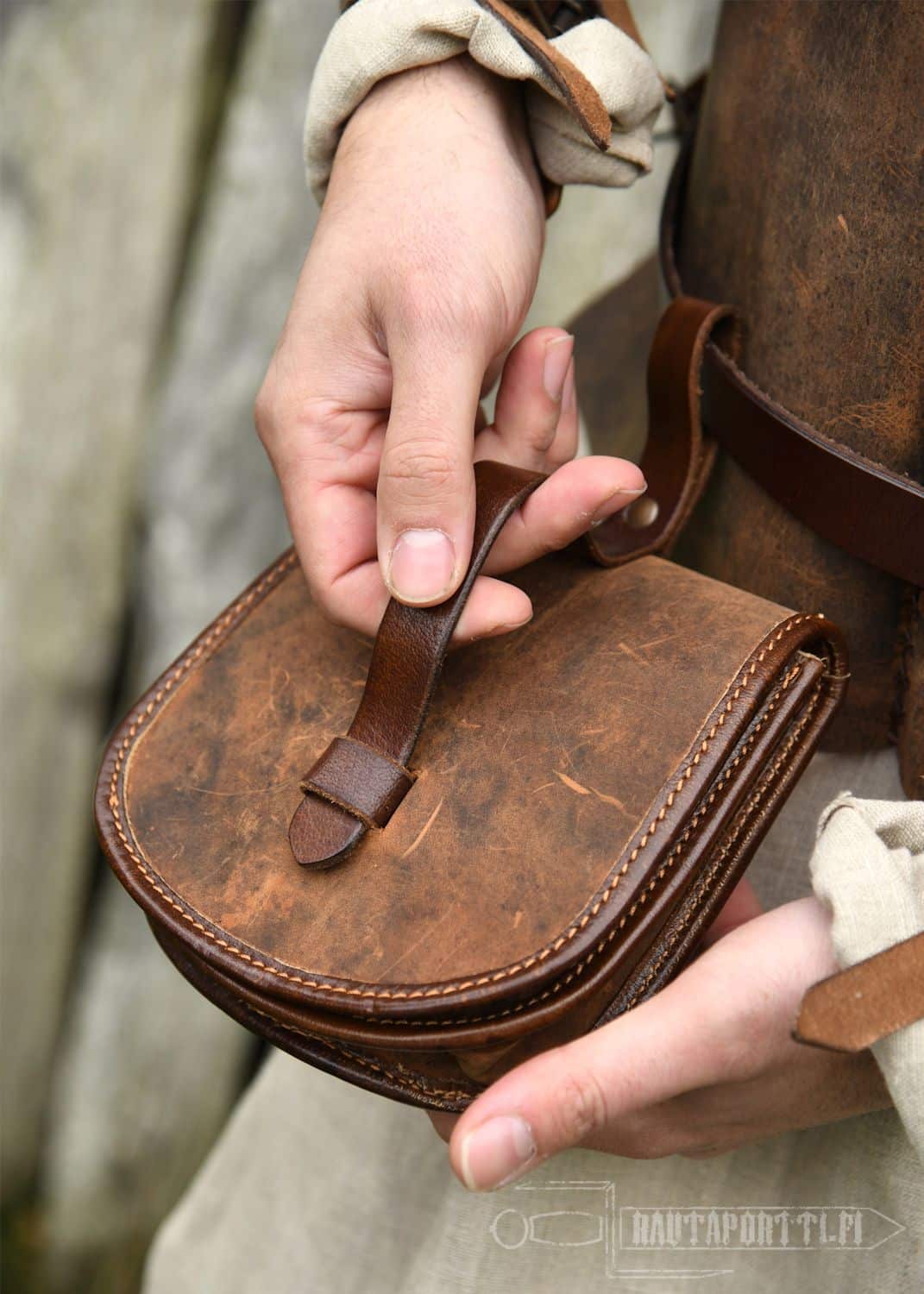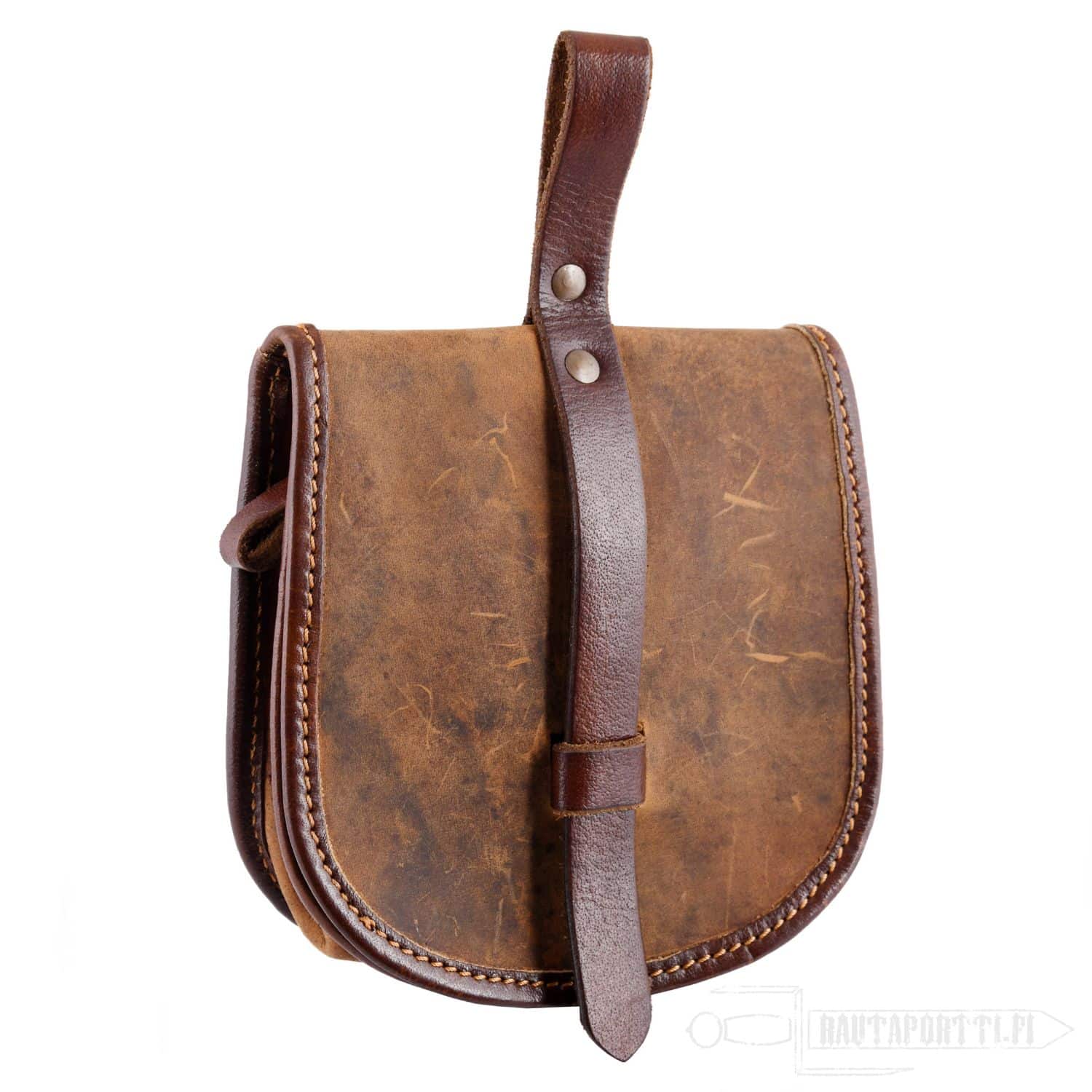 Laukku kiinnitetään vyöhön takana olevalla vyölenkkillä, ja näin kaikki tarpeellinen pikkutavara kulkee näppärästi mukana käsien ulottuvilla. Laukussa on hyvin tilaa modernin tarpeiston, kuten puhelimen, avainten tai lompakon säilyttämiseen. Laukussa on ulkopuolella erillinen nahkaremmi, ja laukku suljetaan tukevalla nahkahihnalla. Laukun reunat on vahvistettu vaaleammalla nahalla.
